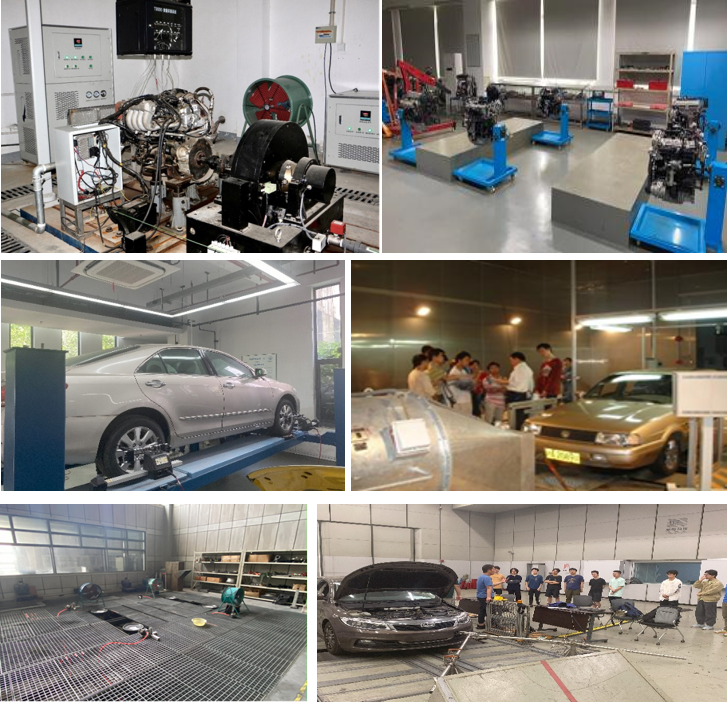 与汽车学院共享实验教学平台,以汽车工程实践能力培养为核心,构建了覆盖汽车构造认知、系统测试、性能试验与综合分析的多层次实验平台。汽车构造实验室配置多类型发动机、变速箱及底盘系统实物与拆装工装,通过拆装实训帮助学生系统理解汽车结构与装配关系;整车与发动机教学实验室配备测功机、排放分析、四轮定位及信号测试仪器,服务于汽车理论与试验课程,强化性能测试方法与数据分析能力;新能源汽车工程中心试验基地进一步引入道路模拟振动台、耐久转鼓测功机及实车试验道路,系统支撑动力性、平顺性与操稳性等综合试验教学,为学生开展高水平实践训练与创新研究提供坚实条件。