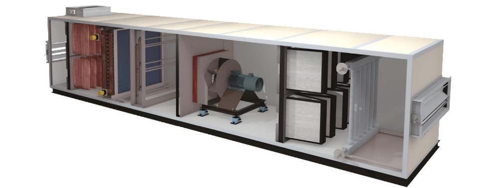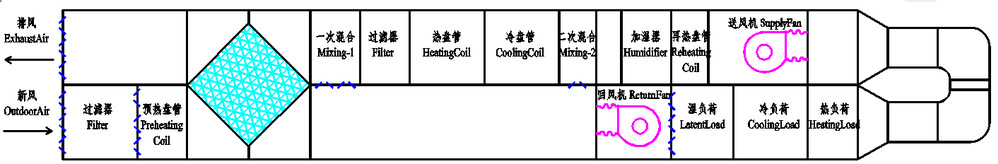 送风段:配置初效过滤器、冬季预热盘管、显热回收交换器、中效过滤器、热水盘管、冷水盘管、加湿器、再热盘管及送风机,用于对送风进行过滤、换热、加湿和输送等综合处理。