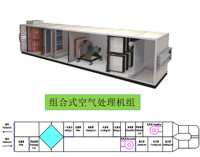 本实验系统采用组合式空调机组,由多种空气处理功能段模块化组装而成,用户可根据实际需求灵活配置不同功能段。整体机组按照空气流程划分为三大部分: