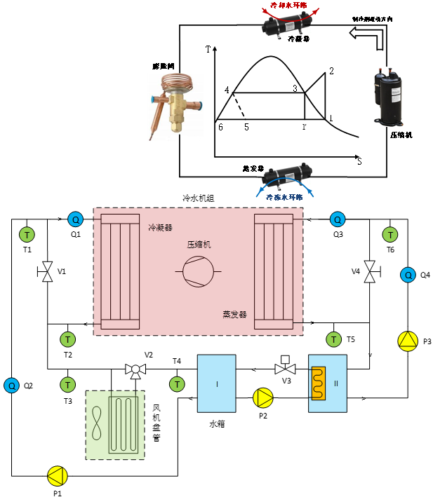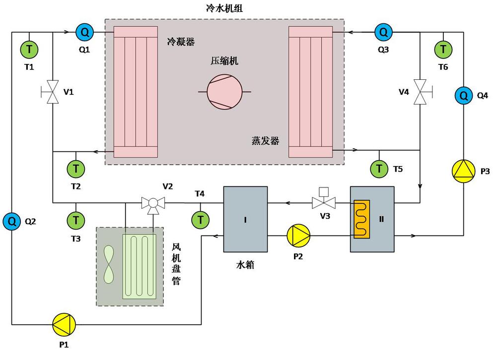 实验系统由冷冻水环路与冷却水环路构成:冷冻水环路吸收负荷侧热量,冷却水环路向源侧散热。系统内设置的两个水箱分别承担吸热与放热功能,并通过电动阀门实现环路混合与能量平衡控制。