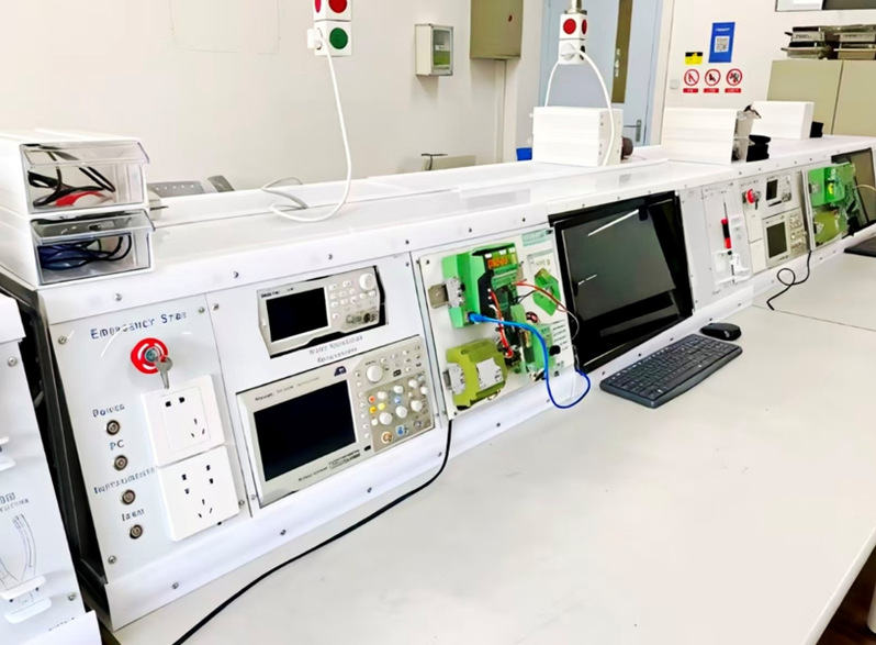 实验台配备德国PHOENIX CONTACT公司PLC控制器共6套,其中ILC 350ETH 4套、ILC 150ETH 2套,并提供配套的编程软件平台,满足教学与工程化实践的需要。课程实验围绕PLC多种编程语言与典型控制任务设置,主要包括:三相交流电动机正反转控制、循环彩灯控制、传感器数据转换模块、整数累加、三层电梯运行控制以及 HMI 人机界面设计等。通过连续的编程训练,学生能够熟练掌握 梯形图(LD)、功能块图(FBD)、结构化文本(ST)等语言的程序开发方法,并提升多语言综合应用与系统联调能力。