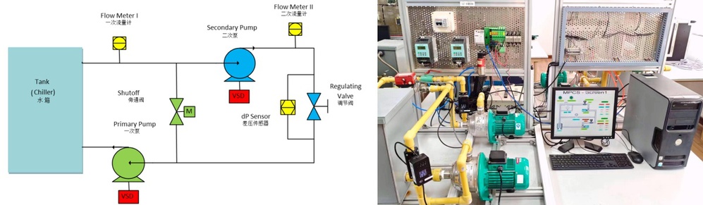 本实验系统用于模拟典型空调系统中的全变频二级泵冷冻水系统及其控制系统。依托接近实际工业现场的设备条件,学生可开展交流电动机变频调速、工业控制对象传递函数辨识与建模、单回路/多回路控制系统的控制器参数整定与性能评价、PLC 控制算法程序设计调试与验证、空调冷冻水控制策略的仿真与实验验证等实践项目。
