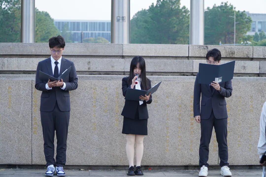 中德工程学院2024级机械电子工程专业学生李高寰、范绮书、何毅在国旗下庄重地进行诗朗诵。