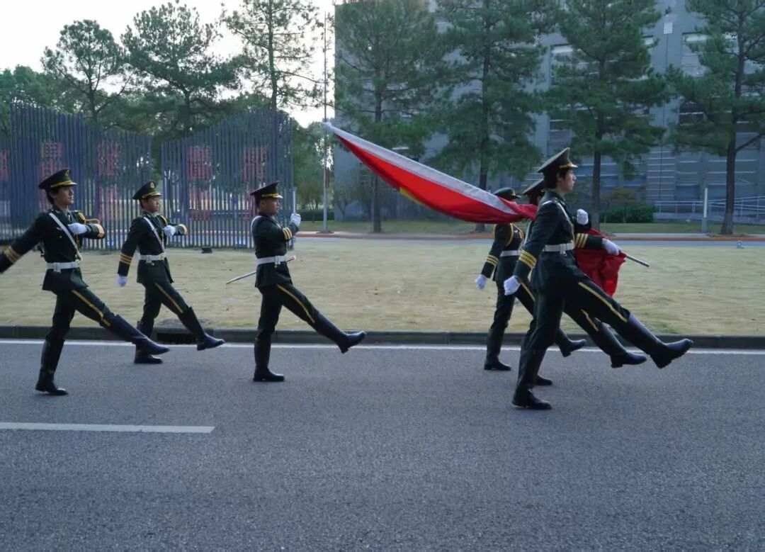 晨曦初破,迎接日出。7时15分许,国旗护卫队的同学们身着戎装,迈着铿锵有力的步伐走向升旗台。