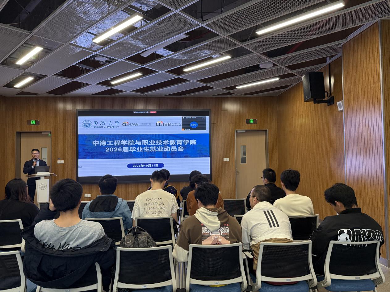 校园秋意浓,逐梦正当时。2025年10月31日下午,为扎实推进2026届毕业生就业工作,引导学生树立正确就业观念,促进毕业生高质量充分就业,中德工程学院2026届毕业生就业动员大会在嘉定校区艺嘉楼210会议室以线上线下相结合形式顺利举行。学院党委副书记曹卢,学院学工办副主任、就业辅导员马阳平、毕业班班主任以及全体2026届毕业生(含在境外攻读双学位的本科生)参加会议。