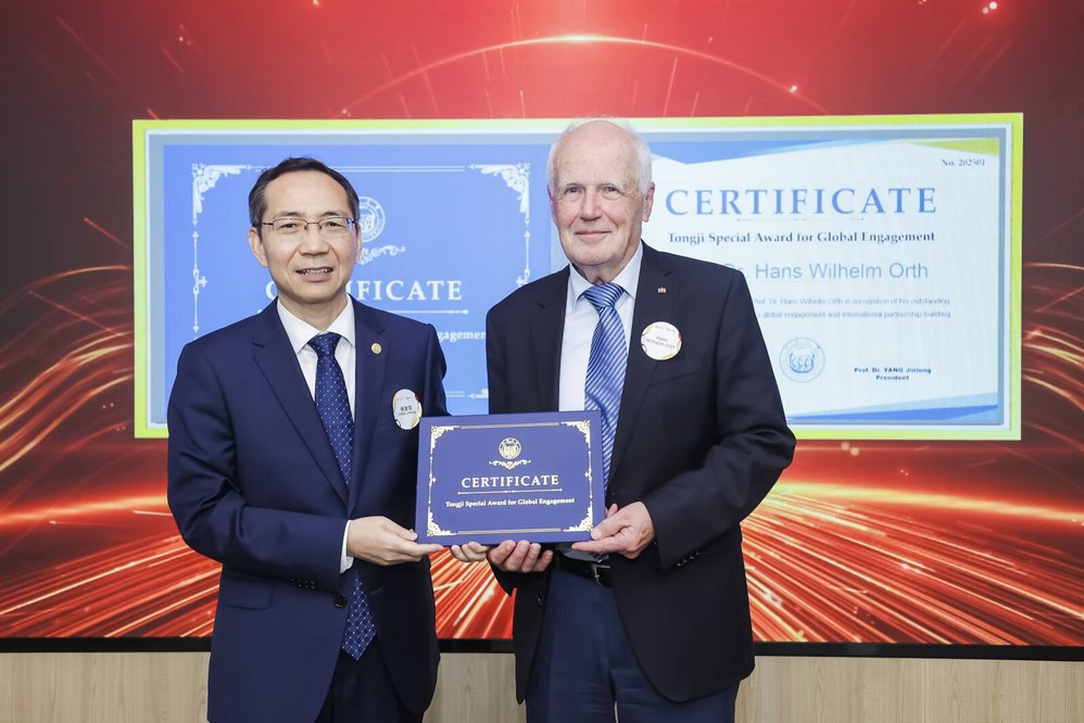 会上,同济大学校长杨金龙代表同济大学授予奥特“同济大学全球参与特别奖”,表彰其对中德合作的杰出贡献。