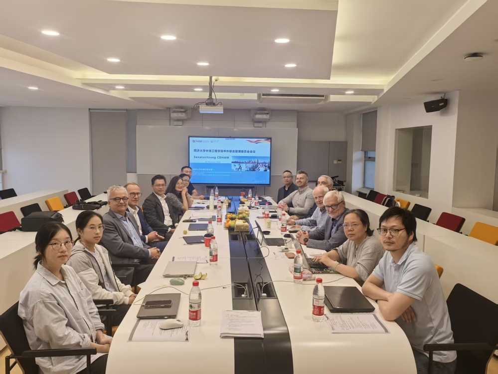 10月16日下午,中德工程学院2025年中外联合管理委员会会议在四平路校区中德大楼举行。中德工程学院德方总协调员奥特(Prof. Dr. Hans Wilhelm Orth)教授与来自齐陶/格利茨应用技术大学、西萨克森茨维考应用技术大学、慕尼黑应用技术大学和纽伦堡应用技术大学的四位专业协调人,同学院领导、各专业负责人齐聚一堂,共绘发展蓝图。