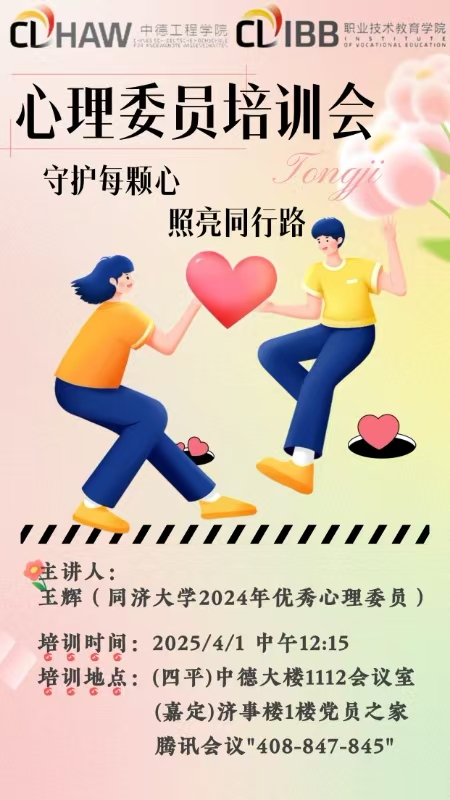 四月的同济校园樱花盛放,春意正浓。为帮助心理委员更好地理解自身角色,强化心理委员危机识别与应对能力,增强班级心理健康工作的实效性,完善校园心理支持网络,同济大学中德工程学院与职业技术教育学院于2025年4月1日12:15开展“守护每颗心,照亮同心路”主题培训。本次培训采取四平、嘉定双校区联动,线下线上同步开展的形式进行,学院心理辅导员杨红梅老师与全体心理委员共同参与。