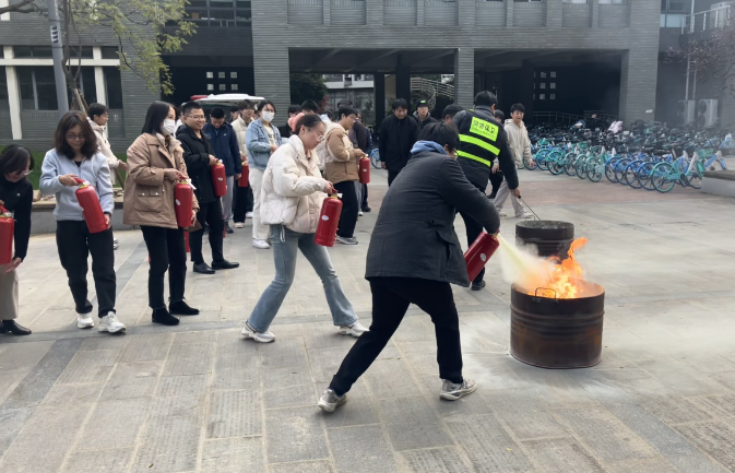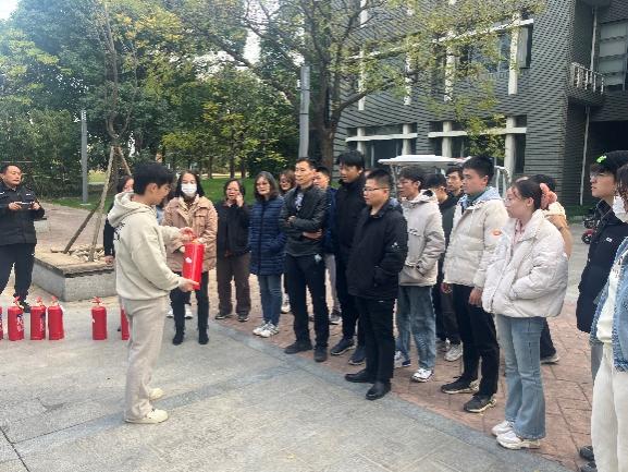 讲座结束后,在楼下空地开展了灭火实操演习。彭老师首先讲解了灭火时人员站立位置等注意事项,并演示了灭火器的使用方法,师生们陆续上前进行实践。