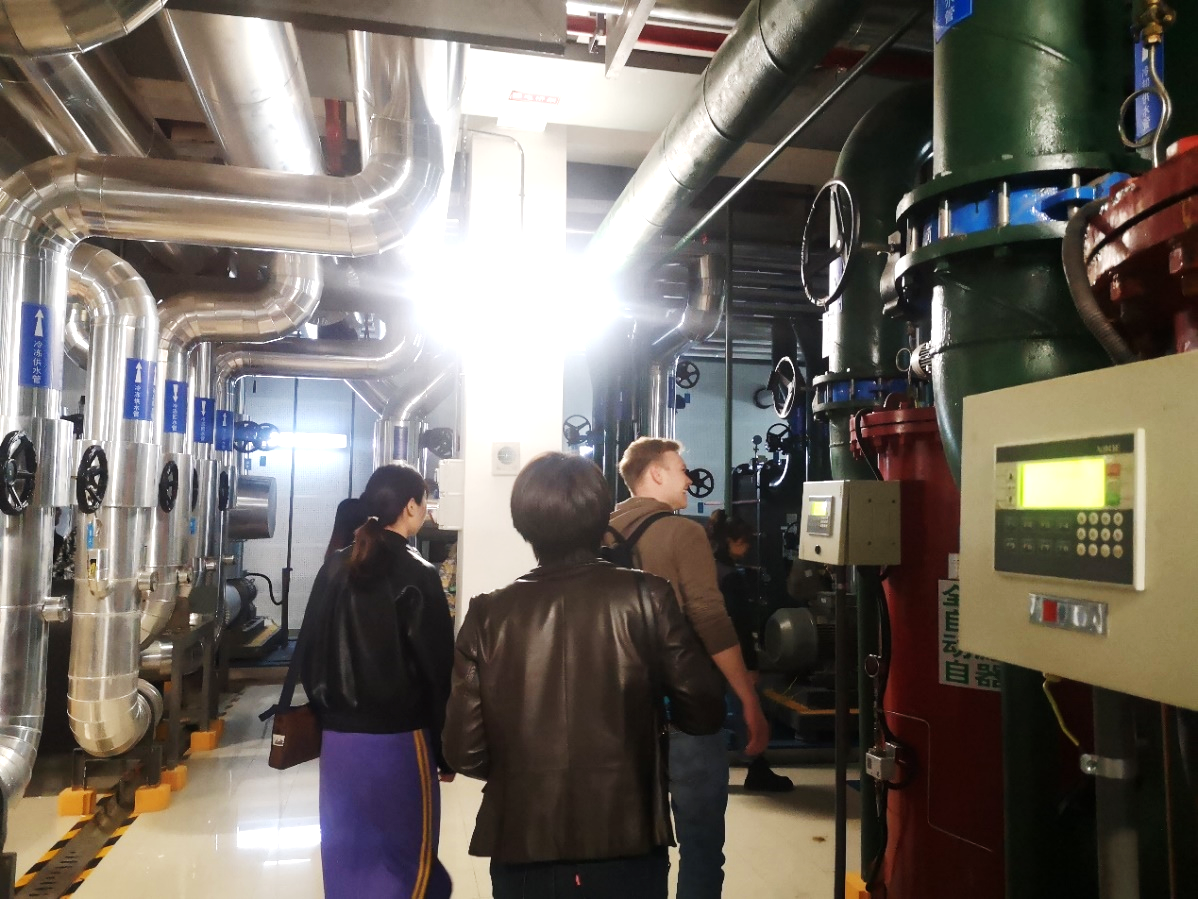 第一站是位于苏州市独墅湖科教创新园区的中衡设计大厦。中衡设计集团副总工程师、电气总工程师傅卫东为师生们讲解了中衡设计大厦电气设计理念,带领师生参观了拍摄多部电视剧的室内环境、设有采光井和光导管种菜养鸡的屋顶花园,还参观了地源热泵机组、锅炉及配套设施的冷热源机房,引导同学们深入感受了大厦的绿色亮点、中式园林美学与低碳节能技术的碰撞。