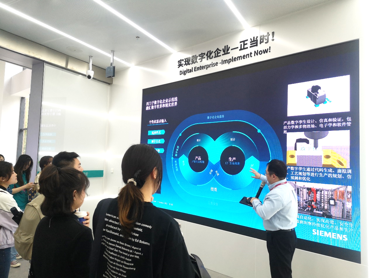 该园区融合制造业的生产特点,运用西门子的自控技术,利用大数据、云计算、5G、边缘计算和物联网等技术,对园区内入驻企业及各类能源和运营数据进行聚类、清理和分析,打造资产全生命周期的数字化综合管理平台,提升园区的智慧运营能力和绿色低碳效率,为产业园区的低碳建设与营运发挥示范效应。同学们认真聆听了智慧园区构架、数字化综合管理平台功能介绍,亲身感受智慧办公环境,并就数字孪生技术在智慧园区中的应用等提出了很多问题。