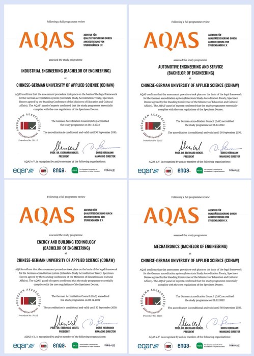中德工程学院是同济大学与德国高校国际合作联合会(DHIK)在中德两国教育部的倡议下举办的中外合作办学机构,学院的采用“3+1”中德本科双学位的培养模式,至今已培养了中德两国双学位生逾2000人,毕业生活跃在中德两国的工业界和经济界。学院在2008年首次通过AQAS认证,并在2014年通过了AQAS再认证,此次为AQAS第二次再认证,认证有效期至2030年9月30日。