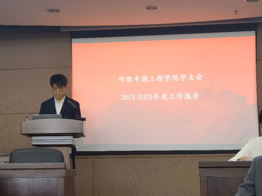 中德工程学院第十六届学生会主席团成员庞泽钰作中德工程学院2021-2022年度学生会工作报告,总结汇报了学生会在过去一年的工作情况以及其中的收获与成长,同时展望了院学生会的未来发展。
