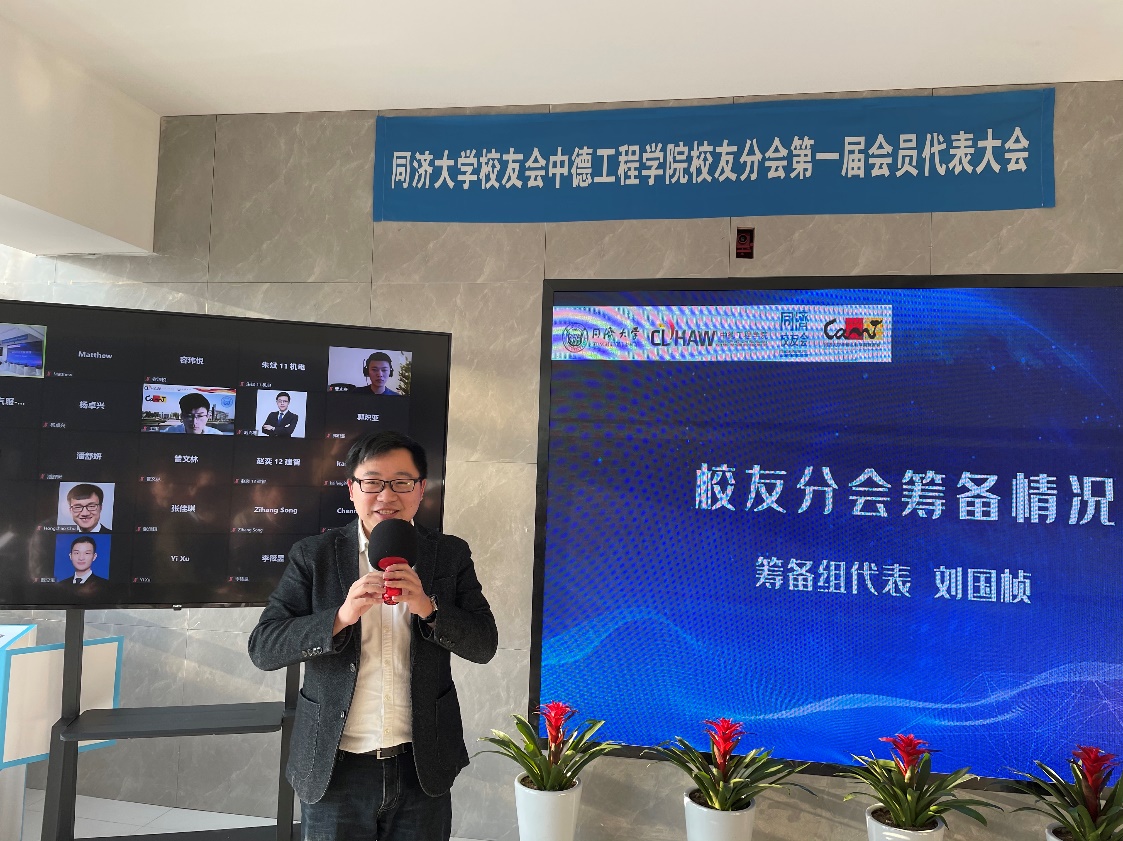 大会筹备组代表刘国桢校友介绍校友分会筹备情况,结合精彩的视频回顾中德工程学院院友会在德国的工作及活动开展情况,希望校友分会成立后进一步促进在中国和在德国院友的交流合作,继续将同济精神发扬光大,为学院和学校做贡献。