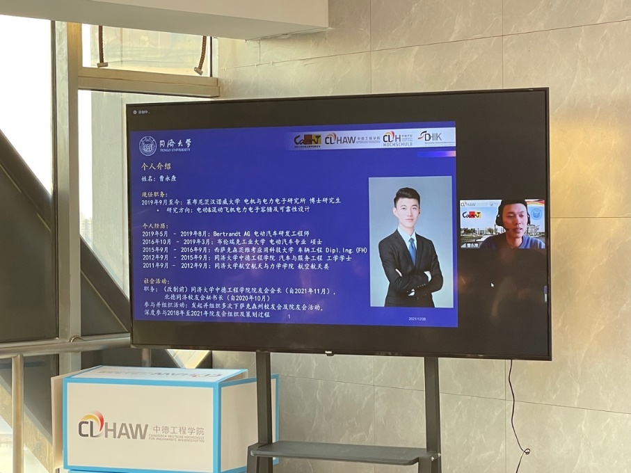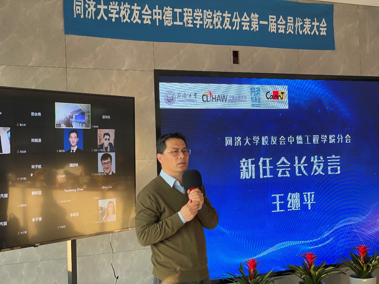 校友分会新任会长王继平发言。他对校友会的支持以及各位院友在疫情期间积极完成校友分会成立筹备工作表示感谢。他讲到,中德工程学院的在德院友群体是最为活跃的群体,为同济师生的访学、交流等活动提供了重要的保障,在新时代中,体现了中德交流合作的理念。在未来,同济大学校友会中德工程学院分会将继续传承前期德国院友会的工作,为院友、校友提供更好的服务。