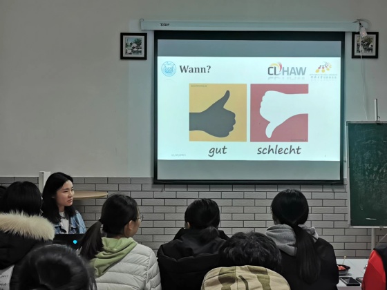 蒋蓓老师的精彩分享向同学们揭示了德语学习的奥秘,让同学们对德语学习有了更加深入和具体的认识。最后,同学们就如何进行德福备考、有趣的德国文化等方面向蒋老师进行提问,蒋老师结合自身经历给出了中肯切实的意见,解答了同学们心中的疑惑。本次活动在同学们的掌声中圆满结束。