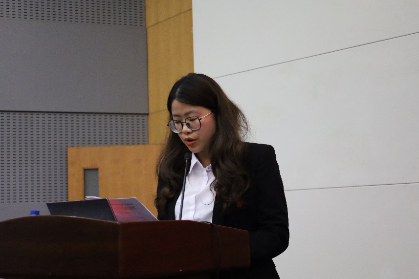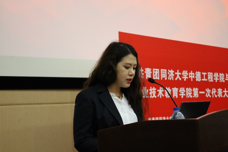陈蕾静老师宣读《共青团同济大学中德工程学院与职业技术教育学院第一次代表大会代表资格审查报告(草案)》及《共青团同济大学中德工程学院与职业技术教育学院第一次代表大会候选人资格审查报告(草案)》