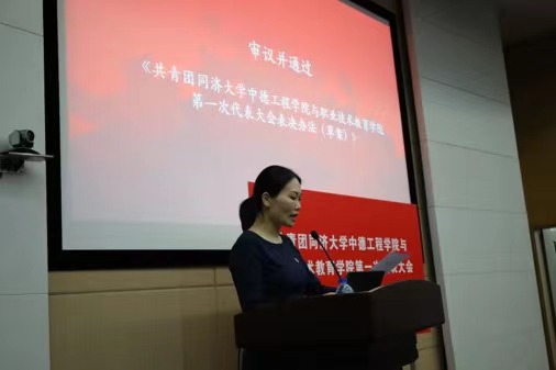 郭婧老师宣读《共青团同济大学中德工程学院与职业技术教育学院第一次代表大会表决办法(草案)》
