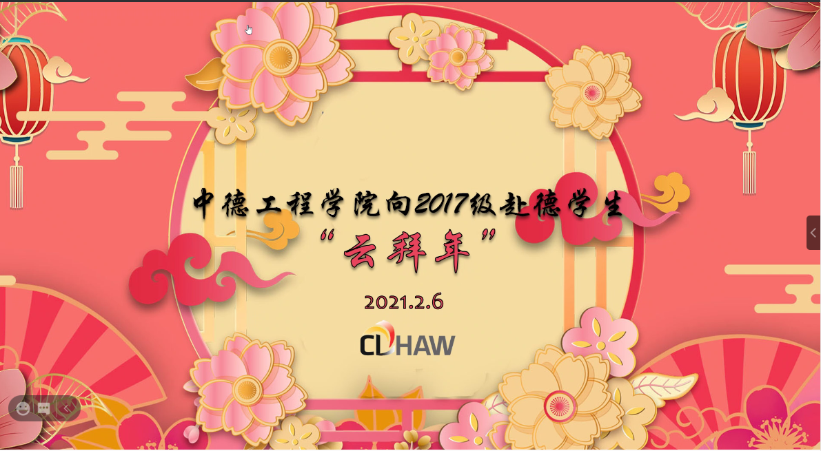 在中华民族传统节日春节来临之际,同济大学中德工程学院组织了“云拜年”活动,向在德国留学的17级同学们致以美好的新春祝福。中德工程学院院长冯晓、党委书记王继平、副院长谢楠、党委副书记郭婧以及17级辅导员和班主任老师们出席了本次活动并亲切慰问了在德学生。活动由学工办姜子琛老师主持。