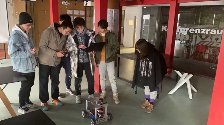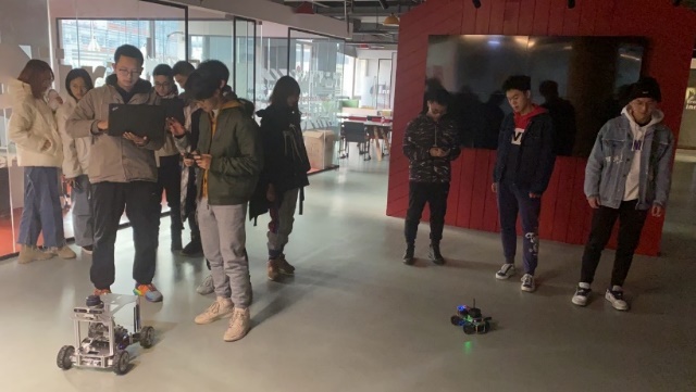 在体验阶段,王琪老师向同学们展示了实验室的两辆ROS智能小车与一辆单片机小车,并从代码层面为大家解释了激光雷达SLAM与深度相机进行三维建模的原理。简单的分组之后,同学们纷纷自己动手操作,发挥主观能动性,在中德大楼三楼的试验区内通过电脑操作智能小车,体验了三维建模的过程。
