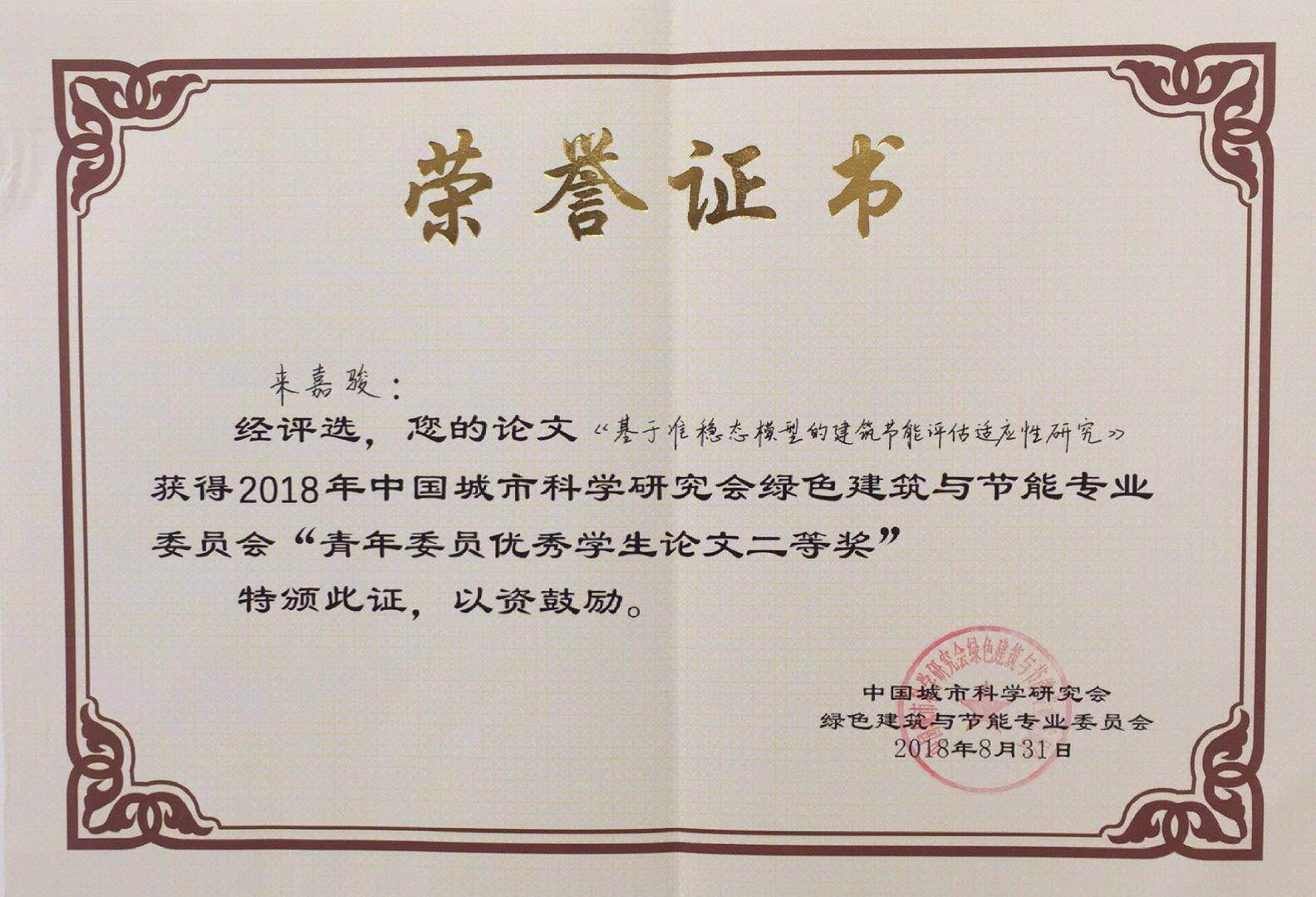 全国征稿后经过层层筛选,共有18篇来自清华大学,同济大学,哈尔滨工业大学等知名高校的优秀论文入围。我院建筑电气与智能化专业2015级学生来嘉骏同学在庄智老师的指导下,撰写的论文“基于准稳态模型的建筑节能评估适应性研究”也入围了,获得现场答辩资格。在会议现场,来嘉俊同学是参选人中唯一的本科生,面对来自其他知名高校的学者和行业专家,沉着冷静地汇报了论文并经答辩得到专家评委认可,最终获得学生优秀论文二等奖的好成绩。本次学术论坛经评委评共有10篇论文获得奖项。
