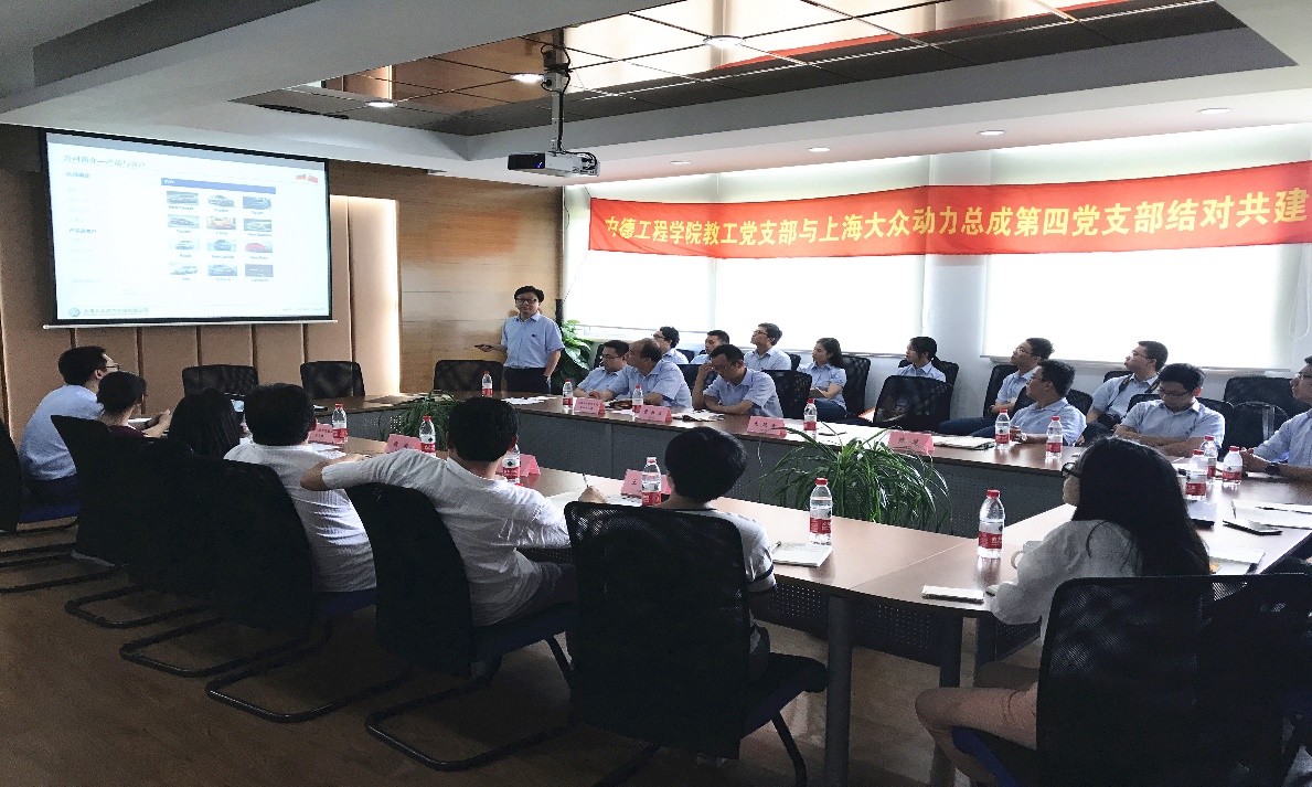 王继平书记发表了热情洋溢的讲话。王继平表示,第一,感谢上海大众动力总成有限公司的领导对学校,特别是对学院、对学院毕业生的认可和支持,促成此次的合作和互动。第二,学院实践教学中的课程设计、实验室建设、实习参观等都有企业参与,这是此次双方合作的基础。高校的根本在于立德树人。与企业深度合作,特别是以加强党建工作为引领,深度挖掘全球领先的现代企业在职业精神、专业水准、企业文化等方面的育人资源,能够有效促进教学,激励青年学生科技报国的热情。第三,期望借助结对、共建,双方多走动多交流,找到更多合作载体,多出成果,实现党建工作与业务工作相互促进。