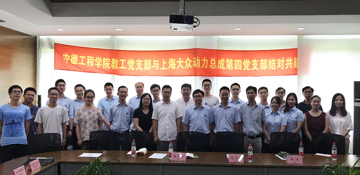 2017年7月13日,上海大众动力总成有限公司第四党支部来到中德工程学院,与中德工程学院教工党支部开展结对共建。学院党委书记王继平、院长冯晓、教工党支部书记谢楠出席会议,大众动力总成有限公司党总支书记尤凤青带队参加交流。会议由中德工程学院毕业生、大众动力总成有限公司党支部成员韦添主持,教工支部和学生支部部分党员同志参加活动。