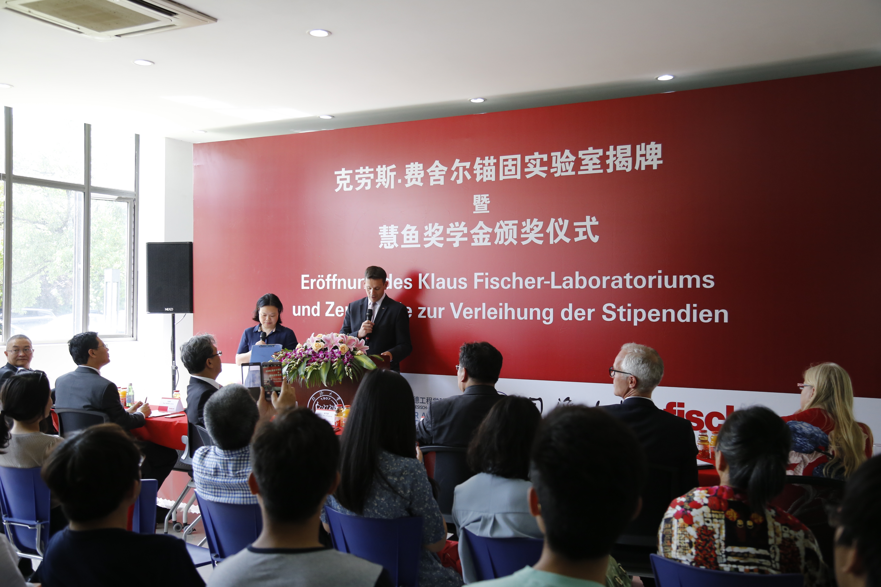 活动伊始,同济大学副校长吴志强教授和德国慧鱼集团执行总裁Mengis先生先后致辞,并与慧鱼集团亚太区负责人Haag先生、同济大学中德工程学院院长冯晓教授共同为实验室揭牌剪彩,众多同济教授和学生们共同见证了实验室的启动。吴校长还与Mengis先生在新的克劳斯·费舍尔锚固实验室进行了该实验室的首个FZA-Q拉拔测试。