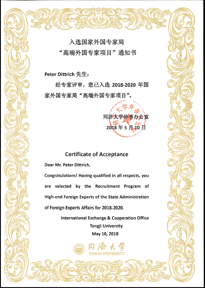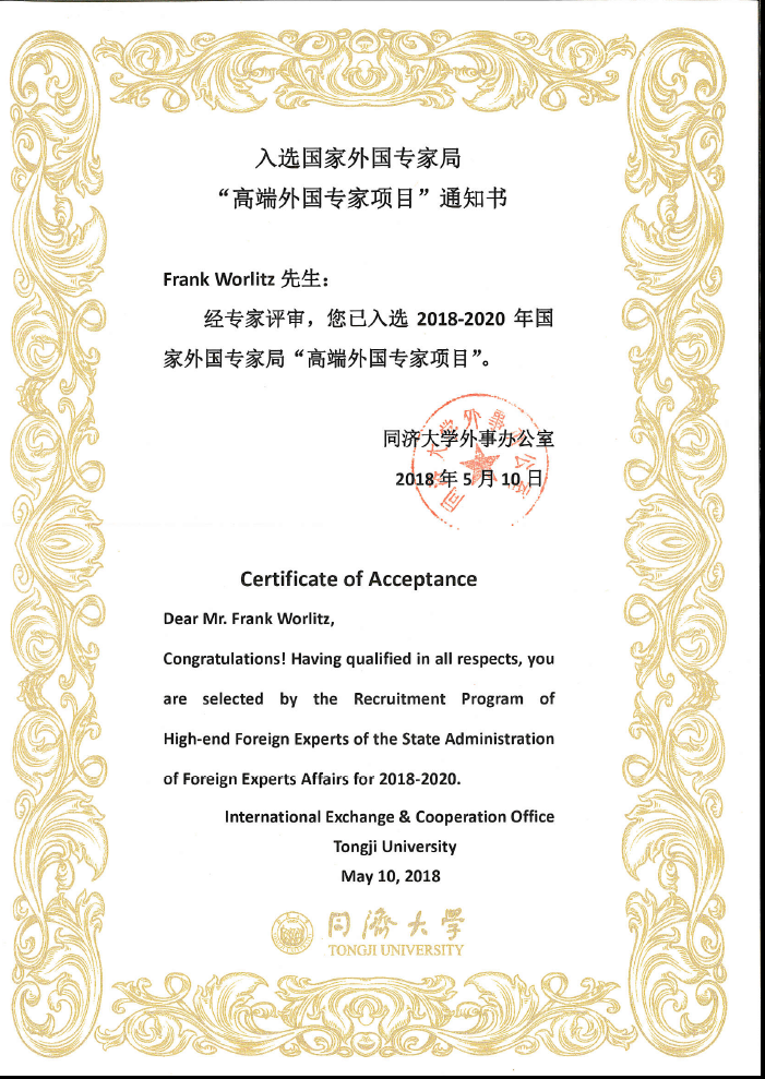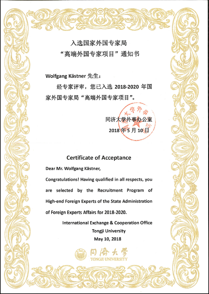 近日,2017年度国家外国专家局“高端外国专家项目”审批结果公布,中德工程学院德国教授Wolfgang Kästner, Peter Dittrich及Frank Worlitz经过各方的严格评审,正式入选2018-2020年高端外国专家。