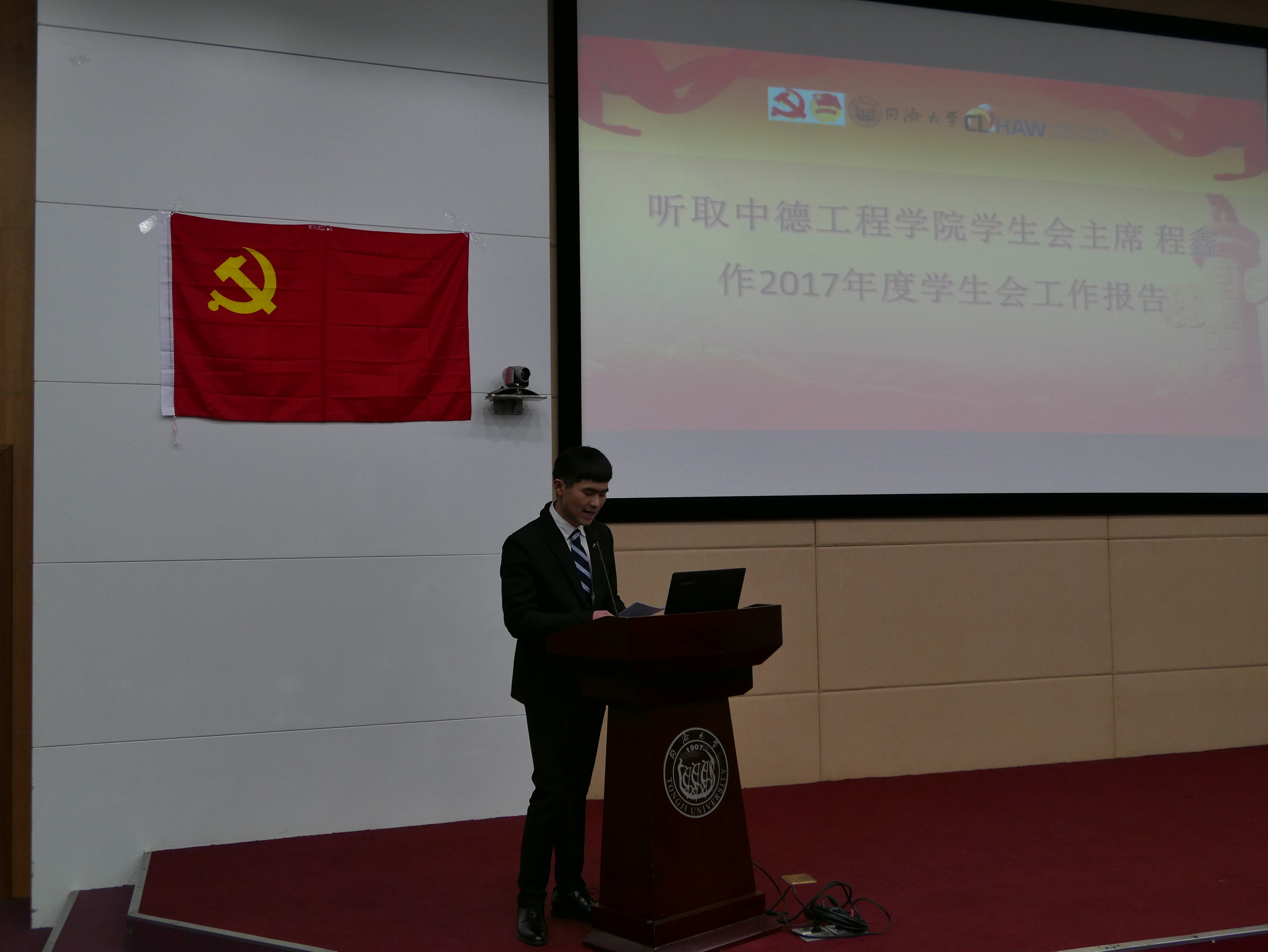 随后,代表们听取了学院学生会主席程鑫“争当怀梦中德人 勇做时代弄潮儿——同济大学中德工程学院学生会2017年度工作报告”,程鑫同学代表学院学生会向与会代表报告过去一年各部门的工作以及学院举办的各类大型活动,同时表达了对下一年工作的美好展望。