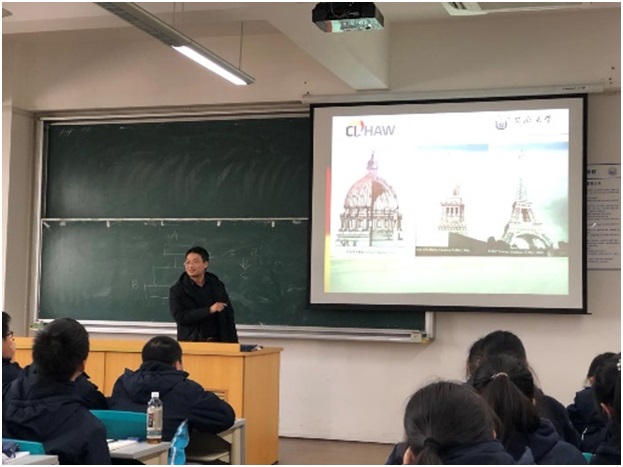 交流会由陈明副院长主持,对同学们的到来表示欢迎,并对交流会的议程做了介绍。冯晓院长致欢迎辞,介绍了学院的基本情况,以及与德国高校合作的现状,并对同学们提出了期望,希望同学们今后能够进入同济大学学习。三个专业的专业主任分别对自己的专业和学生的就业实习情况做了精心的介绍。机械电子工程的谢楠老师介绍了机电在各个领域的广泛应用。汽车服务工程的靳文瑞老师从汽车梦讲起,带领同学们浏览了汽服专业。建筑电气与智能化的张永明老师从建筑行业和能源的发展历程讲起,让同学们感受到了建智带给人们生活的改变。黄治钟老师发布并解释了6个创新课题,涵盖了机器人、建筑和智能等方面,为同学们今后选择创新课题做好准备。