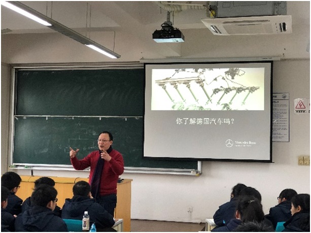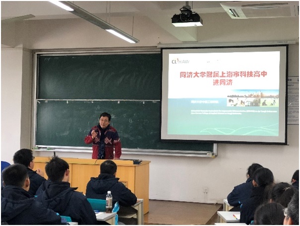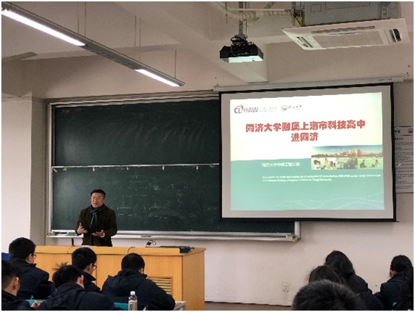 2017年12月25日13:30在同济大学济事楼434上海市科技高中高一两个科创班的60名学生与同济大学中德工程学院的院长、副院长、专业主任进行交流。