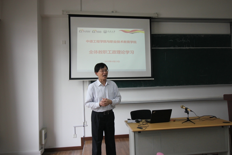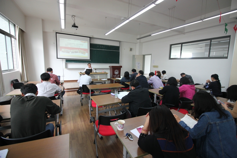 4月23日下午,利用周二下午集中政治学习的时间,学院组织了本学期第三次教职工集中政治理论学习。学院党委首先邀请校教学督导陈祝林教授为全体教师做了关于课堂教学中意识形态问题及课程思政理念落实的督导建议的专题讲座。陈祝林教授从教材、教学、教育三方面论述了课堂是思想教育的主阵地,要从课程思政中立德树人,挖掘与德育有关的学生价值观、人格培养,同时教学需与时俱进、以生为本、不照本宣科。