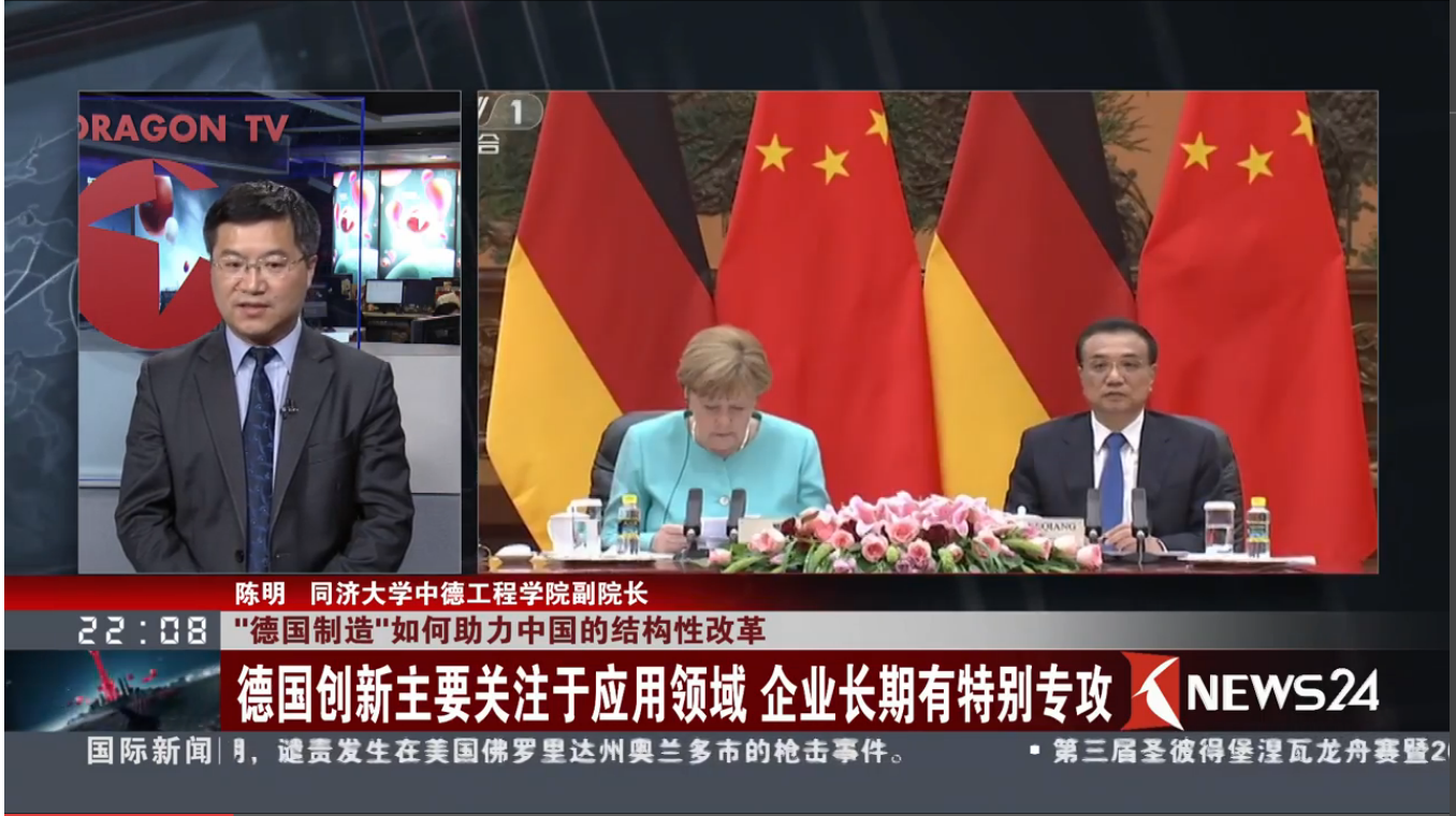 6月13日,国家主席习近平在北京会见德国总理默克尔,祝贺第四轮中德政府磋商成功举办。国务院总理李克强在人民大会堂北大厅举行仪式,欢迎德国总理默克尔正式访华。对于此次默克尔总理的第九次访华之行及中德两国宣布,将推进“中国制造2025”和德国“工业4.0”战略对接,共同推动新工业革命和业态,东方卫视子午线栏于6月13日专访同济大学中德工程学院陈明教授,解析在智能制造背景下,“德国制造”如何助力中国的结构性改革。