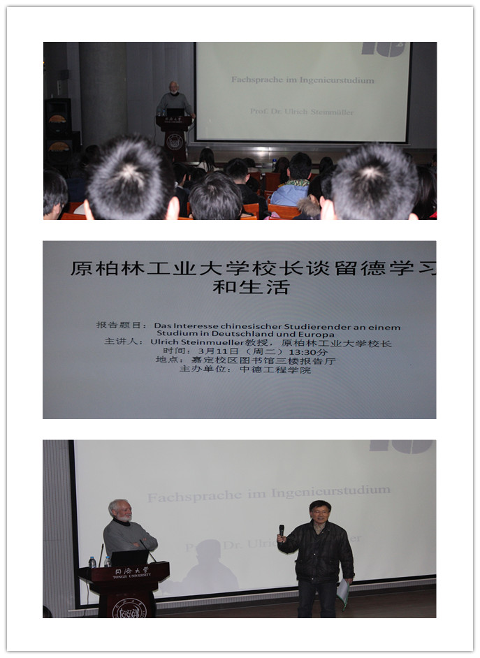 3月11号下午,在春意料峭的嘉定校园,中德工程学院有幸邀请到了原柏林工业大学副校长Ulrich Steinmüller教授,举行了一场题为“Das Interesse der chinesischen Studierenden an einem Studium in Deutschland und Europa”的报告。嘉定图书馆报告厅里早已座无虚席,同学们仔细聆听,Dr.Steinmüller更是耐心地讲解,流畅清晰的德语便于同学理解,并运用生动的事例和丰富的图表,阐述了Fachsprache(专业语言)在德国学习,继续深造的举足轻重的地位。