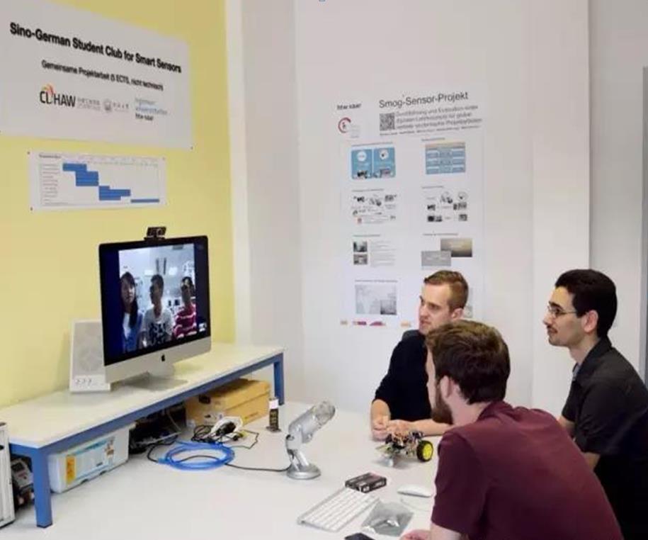 左图:与德国同学进行视频会议 右图:对智能小车进行测试