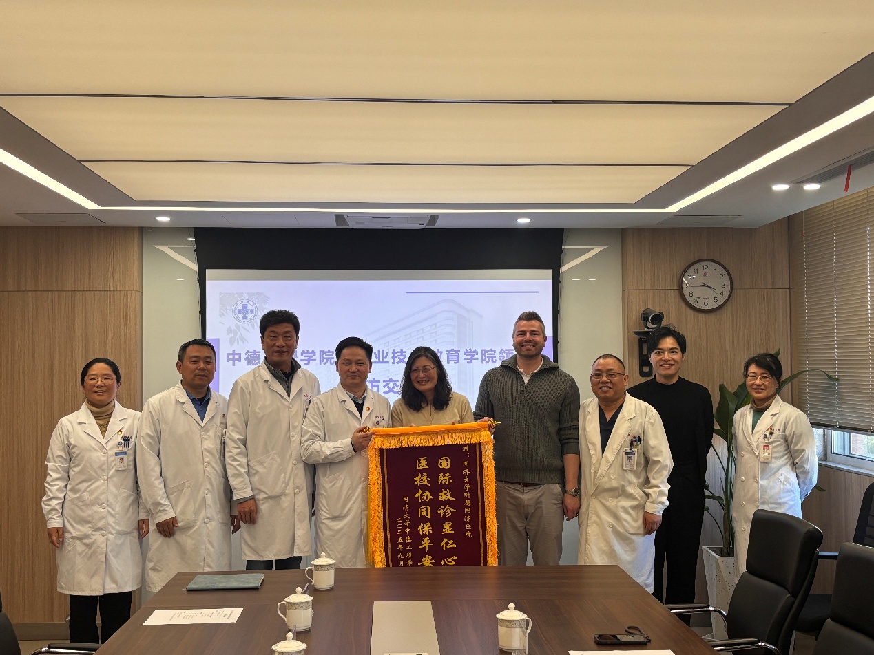 同济大学附属同济医院党委书记高源、院长陈金富、副书记花艳、副院长李冬、党办主任车娜及消化内科主任医师朱风尚等代表医院接受锦旗并感谢中德工程学院对同济医院的信任。双方就未来深化校医协作、保障广大师生健康,为外籍师生提供便捷医疗服务等议题进行交流。